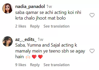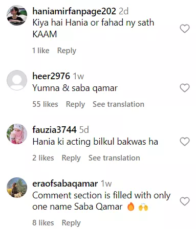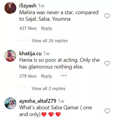 A clip with this particular segment from the show has gone viral on the internet, and netizens are divided over Fahad Mustafa’s statement regarding the best actress in Pakistani showbiz at present. A user commented, “Have you heard of Saba, Ayeza, Sajal, Mehwish, Yumna, and the list goes on and on @mustafafahad26! Hania doesn’t even come closer to ‘em.” A majority of commenters are asking about Saba Qamar and Sajal Ali. Check out the other comments: