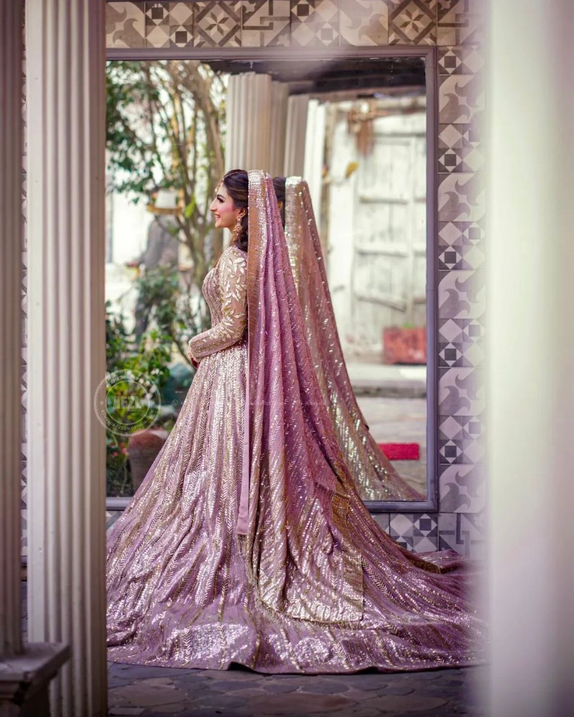 The ethereal bride, Minahil was clad in Manish Malhotra's lavender lustre full-sleeved gown. Her ensemble had featured royal textures and glitz ornamentation, which had made her look regal. It had intricate embroidery and shimmery leafy motifs all over it. She had paired it with a long dupatta, which she had tucked on her head. Her dupatta had glittery motifs on its hemline and small buti work all over it.