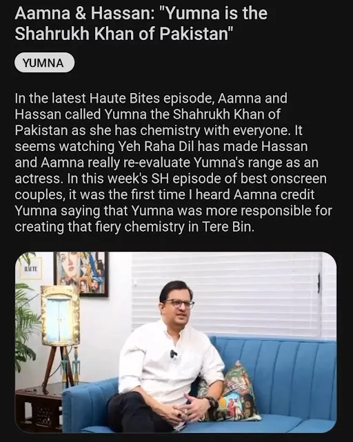 A user recently took to the discussion platform, Reddit, where they shared a clip where Aamna and Hassan credited Yumna for her impeccable acting skills and chemistry with all her co-stars. They added that Yumna can establish chemistry with anybody, which is why she is the Shah Rukh Khan of Pakistan.