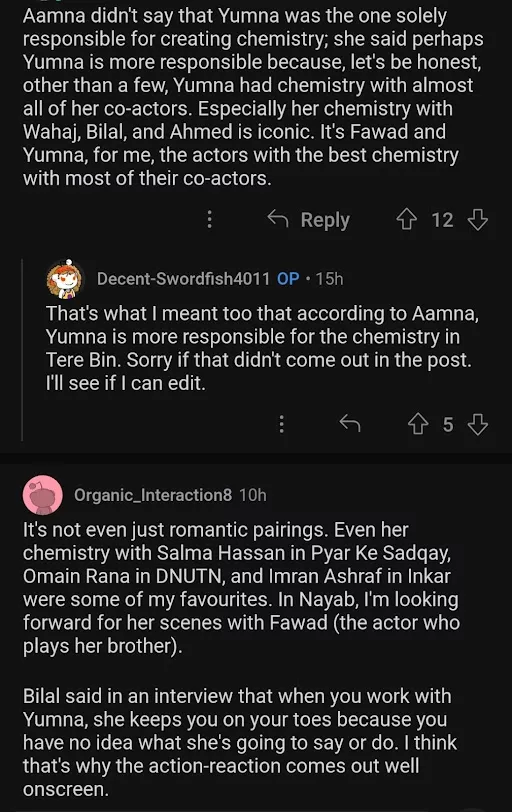 Netizens took to the comment section to mostly agree with Aamna and Hassan’s statement. While the majority of the people agreed that Yumna sparks undying chemistry with all her fellow leads, some even pointed out that creating chemistry is a two-way road. Both the actor and actress involved need to put forth equal efforts to spark chemistry.