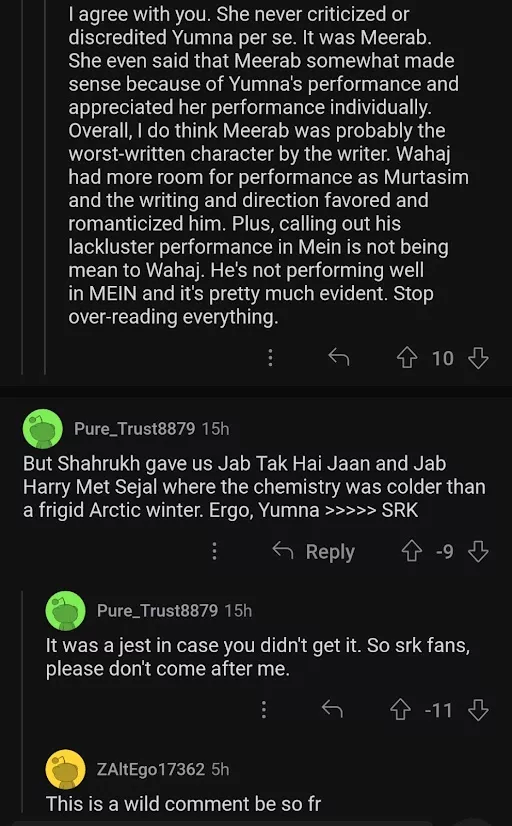 Let us know your views on Aamna and Hassan's comparison of Yumna Zaidi with Shah Rukh Khan.
