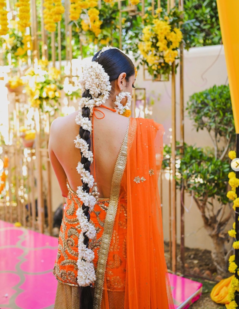 For her haldi ceremony, Misha Japanwala wore a self-designed backless kurta. It featured fish motifs as a homage to her then-fiance, Fisher Neal, whose friends and family call him 'Fish', the short form for Fisher, which she drew on her own and got embroidered by embroiderers in Karachi. Along with it, she wore flowy gold pants and an orange net dupatta with a gota border. She completed her look with a braided hairdo, floral jewellery and subtle makeup. On the other hand, Fisher wore a yellow Benarasi kurta with white salwar pants, also designed by Misha.