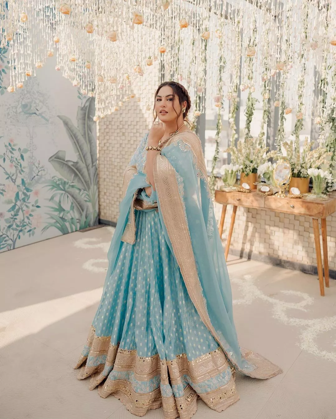 Taking to her IG handle, a few hours ago, on December 26, 2023, Sakshi Sindwani posted breathtaking pictures of her look for her pre-wedding ritual, Sukhmani Sahib paath. In the photos, the gorgeousness was wearing a powder blue-hued lehenga, which featured buttis all over it, along with a scalloped border near the waist and a stone embellished one at the bottom. She teamed her lehenga with a choli featuring floral embroidery with white threads and sequins and a matching-hued sheer dupatta. Indeed, she looked mesmerising. Sharing the pictures, she mentioned: