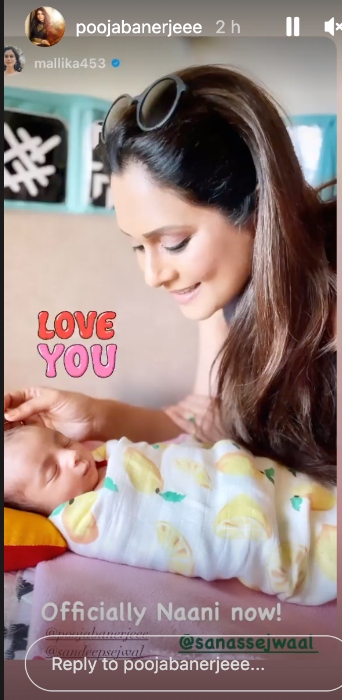 On March 30, 2022, Pooja took to her Instagram stories and re-posted a cutesy picture of her daughter, Sana with actress, Mallika Nayak. In the photo, we can see Sana sleeping like an angel and she looked adorable in a orange-printed swaddle. Atop it, Mallika wrote: