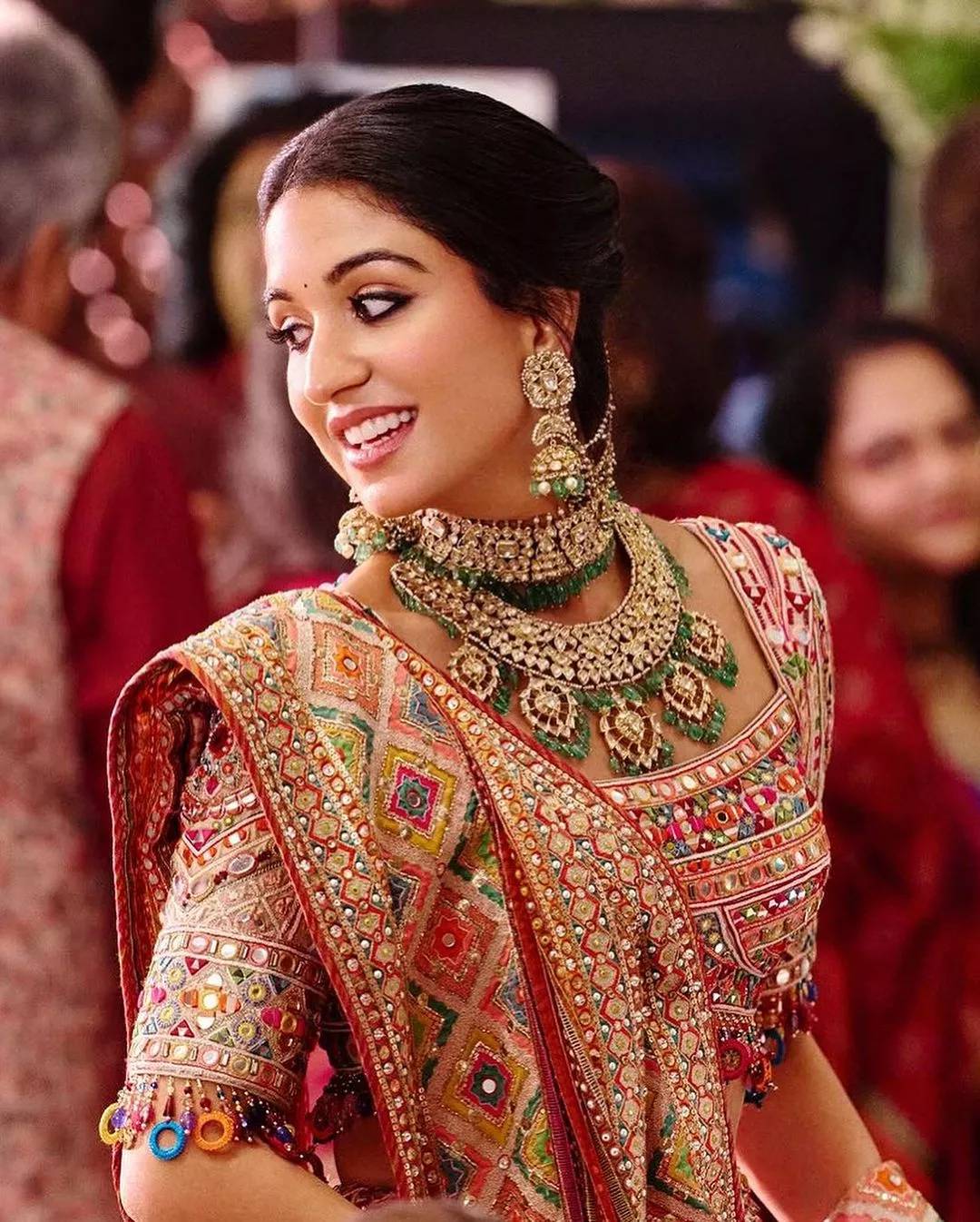 Following the tradition of Ambani ladies, Radhika Merchant also opted for a gorgeous lehenga from ace designer duo, Abu Jani and Sandeep Khosla. Keeping up with the Gujaratis tradition of brides wearing red and white, Radhika also picked a Panetar-styled lehenga. Her outfit had ivory zardozi cut-work, which consisted of a trailing ghagra layered with a detachable trail.