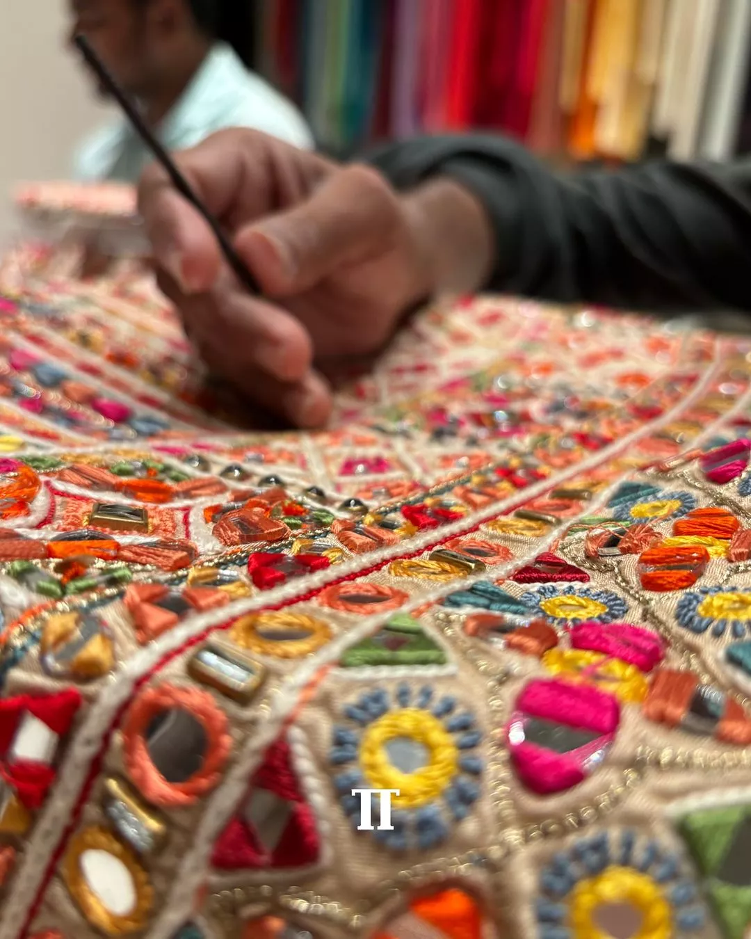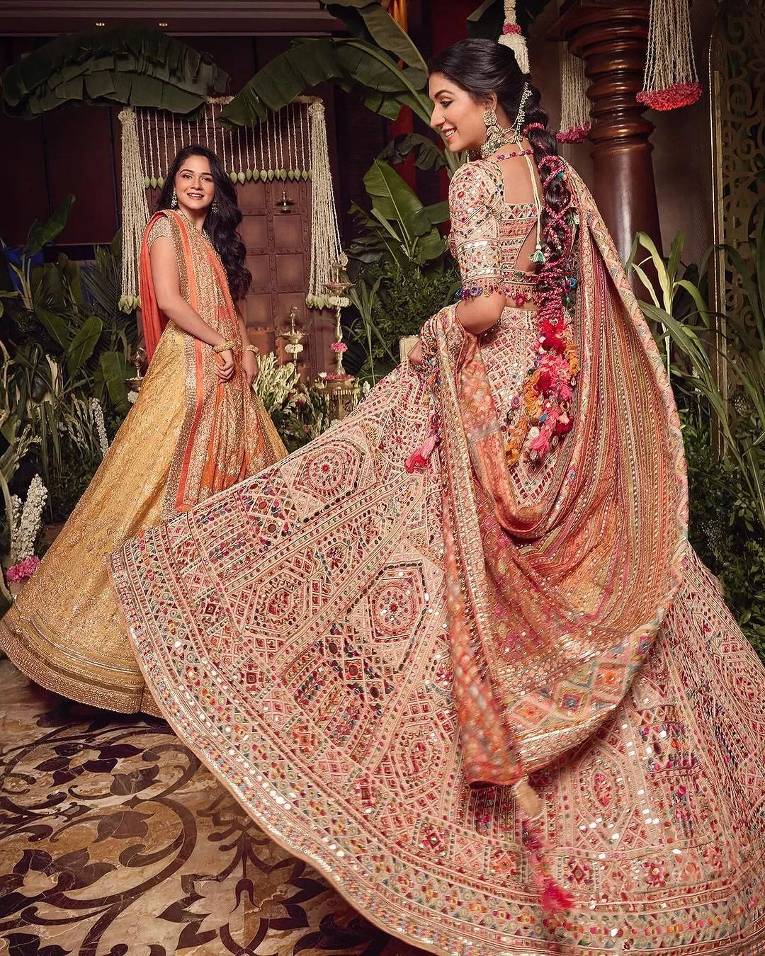 For one of the pre-wedding festivities, Radhika was seen donning a gorgeous Tarun Tahilaini's lehenga. While the details of the function are not yet known, Radhika opted for a Banjara and Kutchi-inspired mult-coloured lehenga. The lehenga had real mirror-work embellishments. Another highlight was Radhika's choli, which had colourful tassels on the sleeves.
