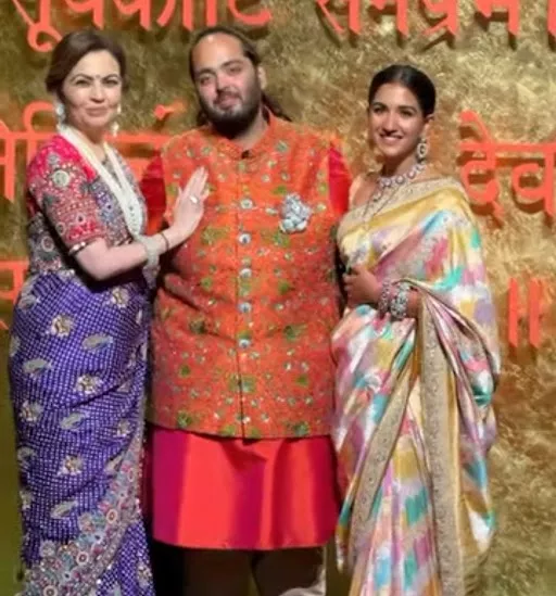 Radhika looked stunning as she exuded grace in a multi-hued silk saree with a broad golden border. She styled it with gold jewellery and a neatly tied bun. Anant complemented his wife in an orange-hued sherwani with a Nehru coat and an elephant brooch. Nita Ambani looked resplendent in a purple-hued saree with a contrasting pink-toned blouse. She paired her attire with a long pearl necklace, diamond bangles, and earrings.