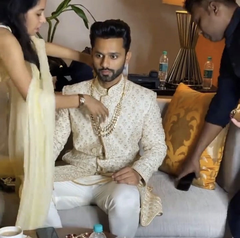 The D-day for Rahul Vaidya and Disha Parmar has finally come. The couple is getting dressed up as a bride and a groom before the festivities begin, and Rahul Vaidya's look as a dulha is finally out. Rahul's friend shared a video on his IG stories, where, Rahul can be seen wearing an off-white sherwani with golden thread work over it. In the video, Rahul's sister can be seen accessorising him with a neckpiece. Check out!