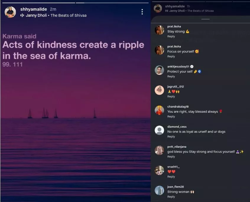 Shhyamali mentioned that she is dealing with a difficult personal situation, as her "Jyotish guru" was diagnosed with stage 4 cancer, which requires her "undivided attention". That is why she mentioned wanting to stay away from any drama or controversy at the moment; however, her latest post on "karma" might have reignited talk of her link with Samantha and Raj. Shhyamali also stated that she has been practicing "Meditation on Twin Hearts" for years and believes the positive energy she sends out is now returning to her during this challenging phase.