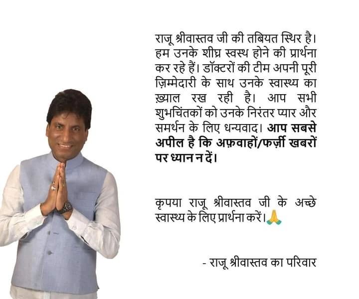 "I would like to inform people to not believe any rumours. Raju ji's condition is gradually and slowly getting better. Doctors are also saying that he is showing a positive response. There are no signs of negative results in his reports which is again a positive sign. Also, Raju ji moved his hand and fingers which doctors have informed us. He is a fighter, he will be back. I just want to request everyone to pray for his health. The doctors here are doing their best and giving good treatment. Our motive is to stop people from spreading rumours and negative stories. He is stable now and things are improving and he is showing signs of recovery."