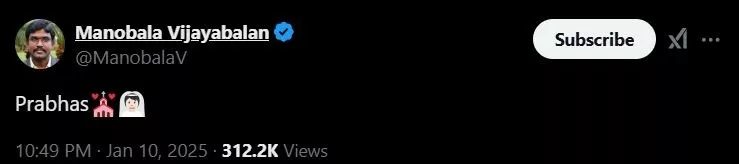 Following the same, Manobala Vijayabalan, a film trade analyst, took to his X (Twitter) and shared a cryptic note, wherein he penned Prabhas' name followed by a bride and a home's emoticons. The purpose of the tweet could not be understood, but netizens in the comment section started discussing the same. While some wondered that Prabhas might be shooting for a wedding scene, others asked if the actor is actually getting married.