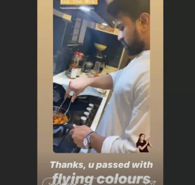 Not just for the video, Ram Charan is helping his wife otherwise as well. At this point of time, Ram Charan is spending time with his wife, Upasana and family in quarantine. The actor, who has been active on social media, had shared a video of him cooking something for his ladylove in the kitchen. Along with the video, the actor had written a sweet caption that could be read as “Cooking dinner for the Mrs.” The doting wife, Upasana had taken a screenshot of the video and had posted it on her Instagram stories, along with a reply that could be read as “You passed with flying colours.” Take a look. (Don't Miss: Sanjeeda Shaikh Walked Away From Husband, Aamir Ali And Their Marriage Without Informing Him)