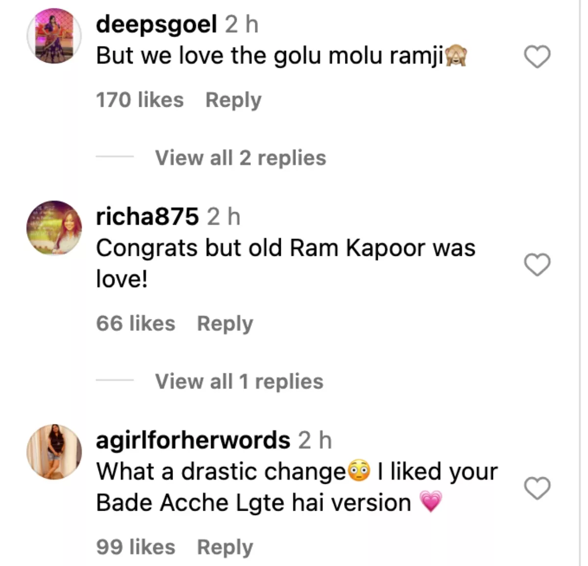 As soon as fans and his friends saw his picture, they were in disbelief. One user wrote, "Congrats but old Ram Kapoor was love!" Another one commented, "What a drastic change I liked your Bade Acche Lgte hai version." A third user penned, "Oh my God! I could not recognise!"