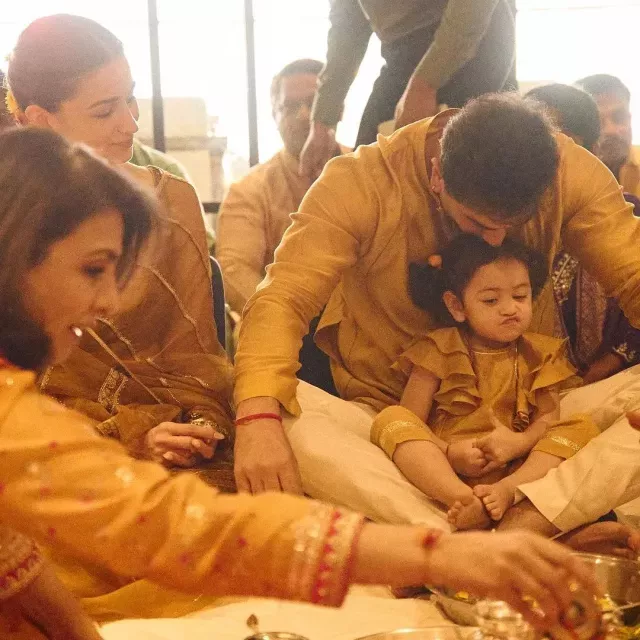 For their Diwali celebration, the Kapoor-Bhatt family made a stunning sight in their coordinated yellow-hued outfits. Ranbir's yellow silk kurta was a perfect match for Raha's tiny kurta set, both made from the same material. The twinning moment was a visual treat that warmed our hearts. Another picture captured a playful Alia making a goofy face at her baby girl, while Ranbir planted a kiss on her head. This candid moment was so heartwarming, it made us pause and shed tears of joy.