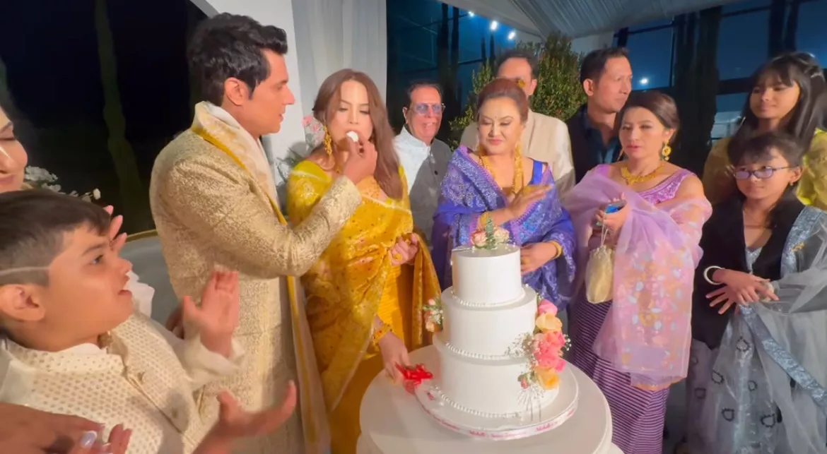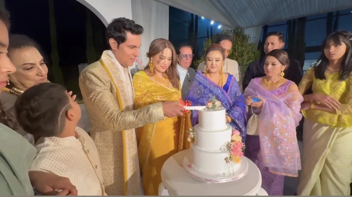On the other hand, Randeep donned a cream-hued heavily embroidered sherwani styled with a doshala. The duo was seen cutting a three-tier fondant cake with colourful flowers adorned on it. The cake also had a detailed rose string design featuring green leaves and other realistic-looking ornaments. Randeep was seen feeding a piece of cake to his bride, while the guests happily cheered for them.