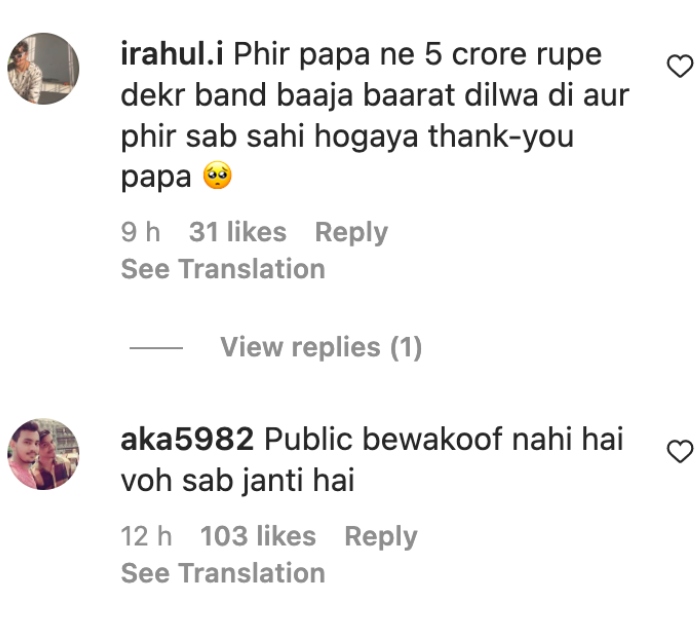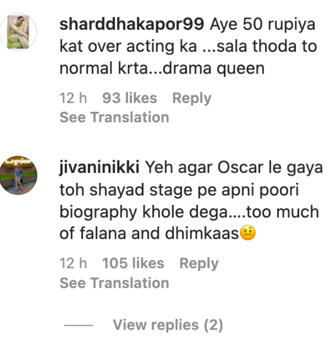 However, this didn't go down well with the netizens and they trolled the actor. One user wrote, "Aye 50 rupiya kat over acting ka ...sala thoda to normal krta...drama queen." Another commented, "Bas kar bhai har jagah rona pitna shuru kar dete ye miya biwi dono ek jese hai." One netizen penned, "Phir papa ne 5 crore rupe dekr band baaja baarat dilwa di aur phir sab sahi hogaya thank-you papa." Check it out: