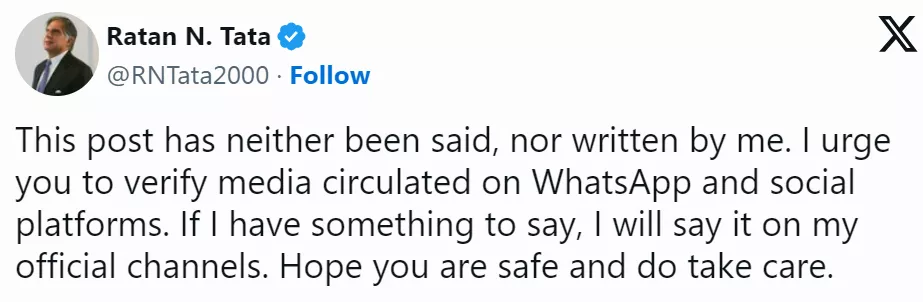 It was back in April 2020 when Ratan Tata took a firm stand against fake news in India, which had become a headache for society as the authenticity of information was getting compromised. As a result, when a fake interview of Ratan Tata sharing his views on the impact of COVID-19 on the Indian economy made its way to the internet, the billionaire confirmed publicly that those were not his words. Sharing the snippet, Ratan Tata told people to refrain from such pieces that hold no credibility.