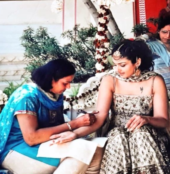 Raveena Tandon has always been a fashionista, even in the 90s. For her mehendi, she was seen decked up in a strappy cream-toned sharara, which featured flared pants, a fitted kurta with strappy sleeves and a dupatta. She looked stunning as she styled her look with earrings and a maang teeka. Subtle makeup with hair tied in a high ponytail completed her look.