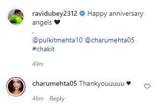 On the other side, Sargun Mehta also took to her Instagram handle and wished her sister-in-law with a cool picture in which we can see all four of them in their comfy and cool outfits. The picture speaks volumes about their bond, as all of them can be seen posing with broad smiles on their faces for the camera. Along with this cute photo, Sargun wrote a caption and it can be read as "Happy anniversary to my dil ka tukda's. I love you both to the moon and back. Aur ab toh zyaada because you gave us sahraaj HAPPY ANNIVERSARY @charumehta05 @pulkitmehta10 Ps : if you love charu too , she loves winning those Instagram giveaways .. jitwado isse." Soon, Charu dropped two adorable comments on her sister's post, and it can be read as "Thankyouuuuu" and "There is one ending tonight. I hope I win." Take a look: