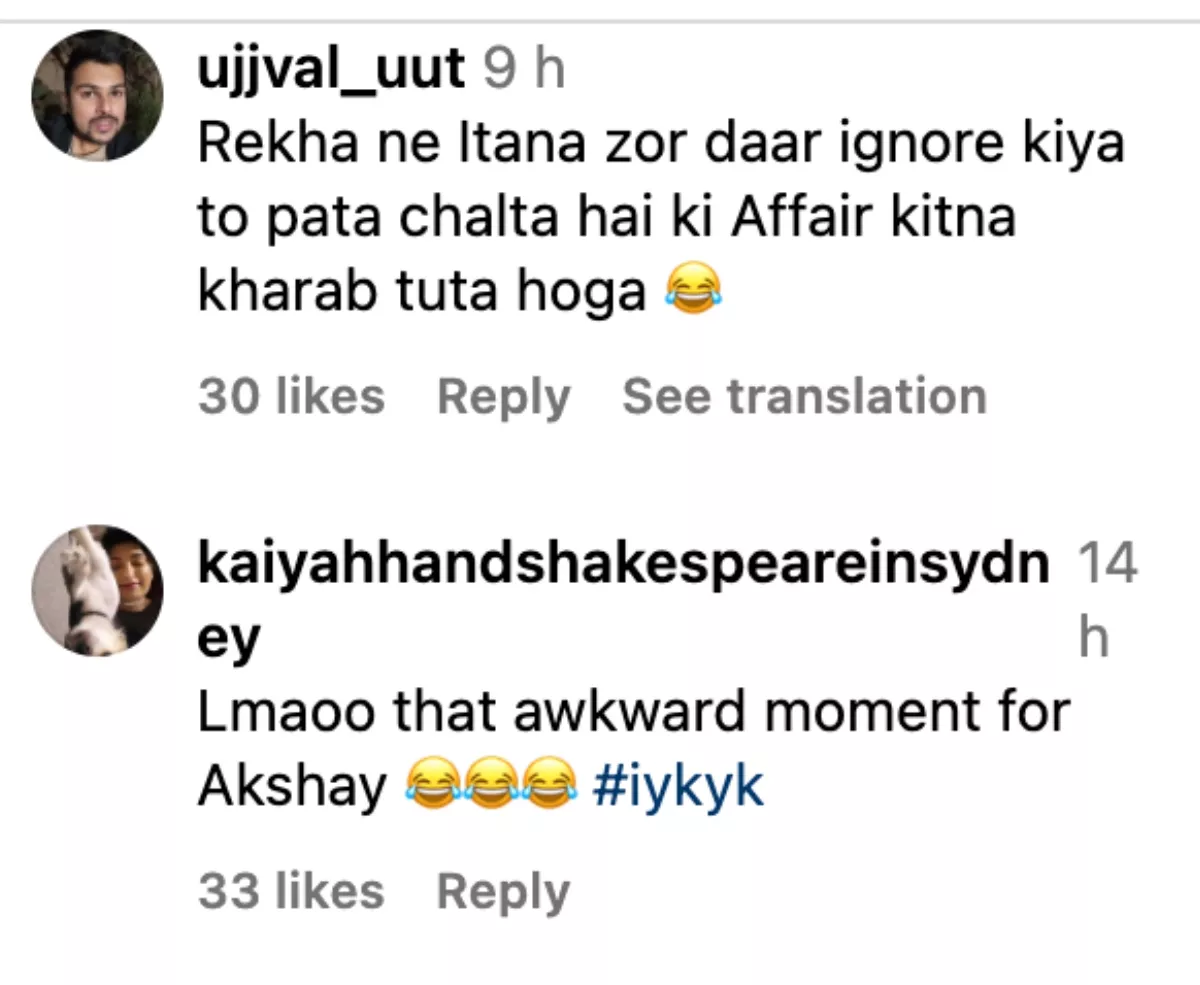 Netizens were quick to notice the way Rekha ignored Akshay. One user wrote, "Rekha ne Itana zor daar ignore kiya to pata chalta hai ki Affair kitna kharab tuta hoga." Another one commented, "Lmaoo that awkward moment for Akshay." A third user penned, "The way Rekha ignored Akshay Kumar, it's proved that they had a pad, while Shilpa shetty is like let bygones be bygones.