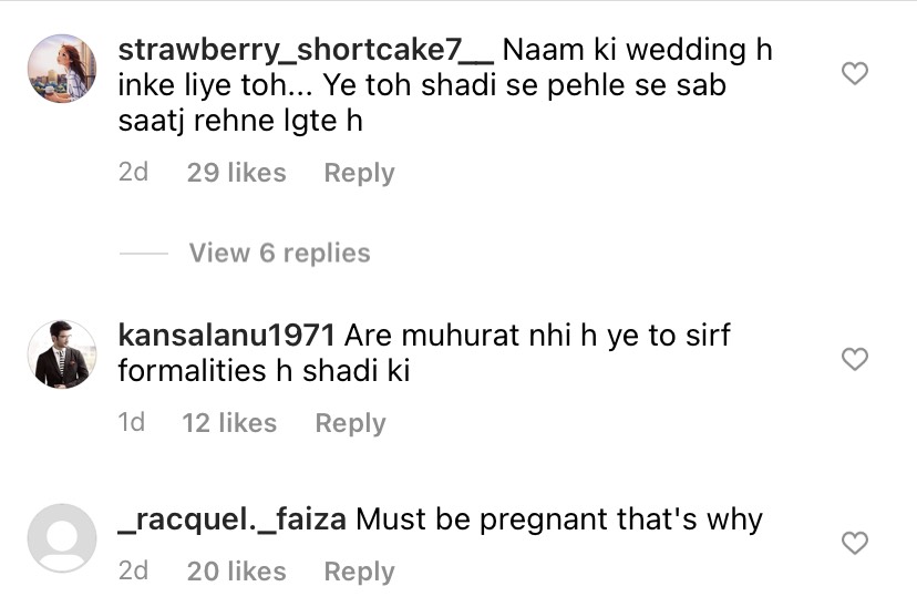 Rhea Kapoor and Karan Boolani’s wedding was super-intimate, so much so that their fans had wondered if they had even tied the knot. A section of netizens started trolling them for the same. While some commented that their wedding was just a formality, some wondered if Rhea is pregnant. One user commented, “Naam ki wedding h inke liye toh... Ye toh shadi se pehle se sab saatj rehne lgte h,” another user wrote, “Must be pregnant that's why.”