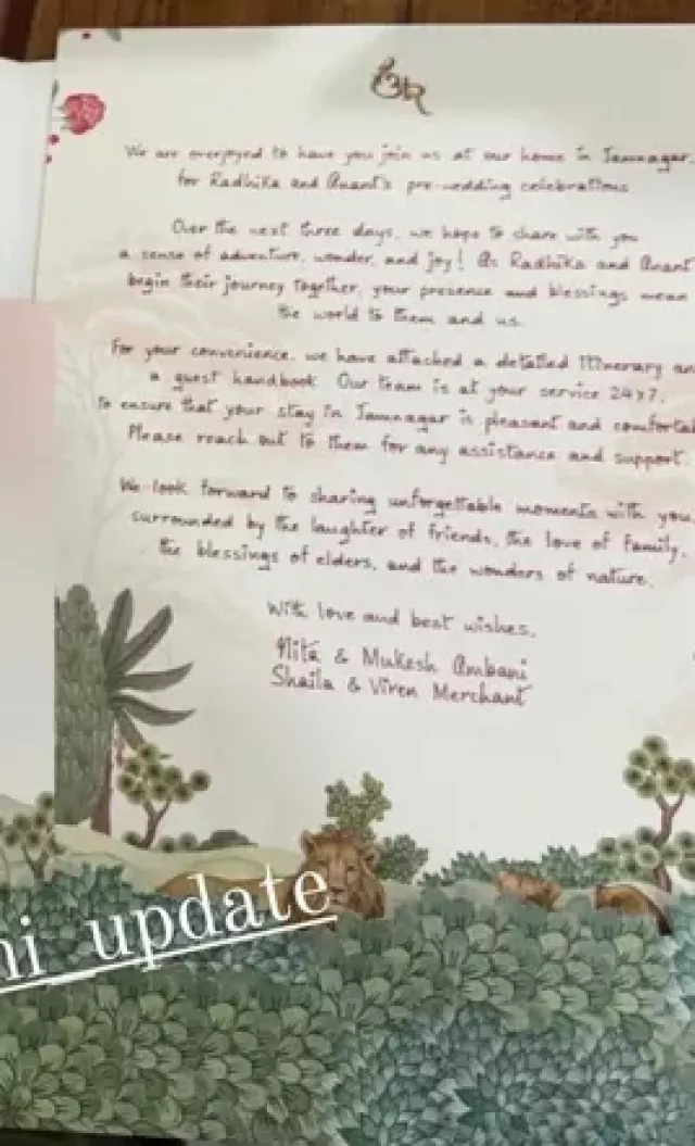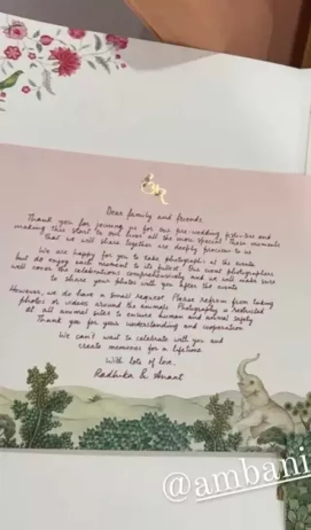 Recently, one of the Ambanis fan pages uploaded a picture which featured a handwritten note by Anant and Radhika written to their esteemed guests. The note was written on a jungle-themed card and featured the couple's initials on top of it. In the note, the two youngsters thanked their family and friends for being a part of their three-day grand celebrations. They requested their guests to refrain from taking photographs around the animals and at various animal sites. The duo has also mentioned that they have arranged for their event photographers, and all the guests will get their pictures after the celebrations.