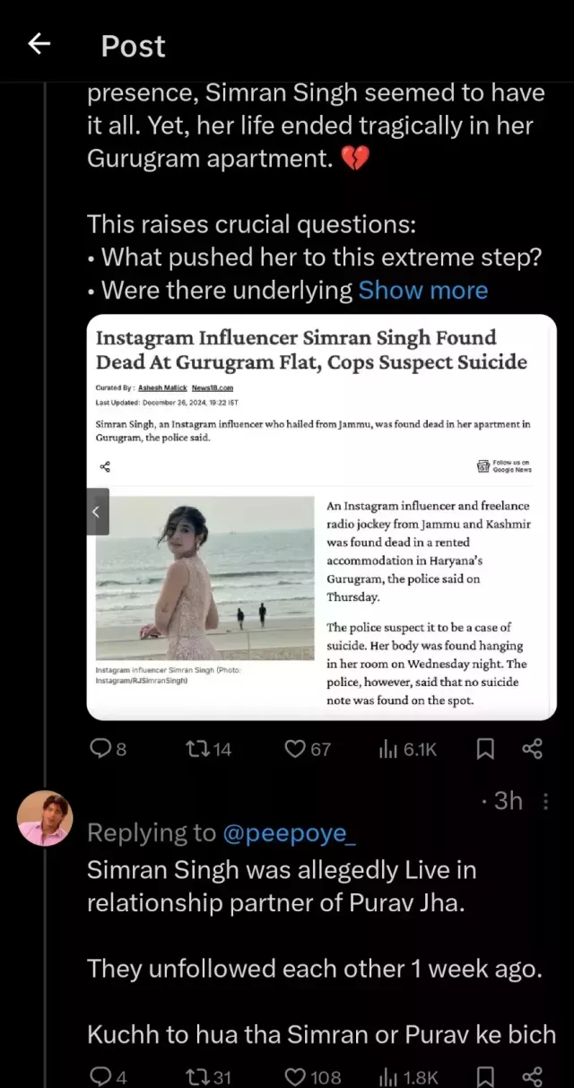 Simran Singh, a famous influencer and freelance RJ left everyone broken after she bid farewell to the world, reportedly by committing suicide. It was on December 26, 2024, when the 25-year-old influencer was found dead in her Gurugram apartment. While the police had closed the case by claiming it to be a suicide only, her fans claimed that there must be something that is fishy. Some of her fans even linked her suicide to her alleged ex-BF, Purav Jha. Now, Purav took to his IG handle and shared a heartbreaking note, as he missed Simran.