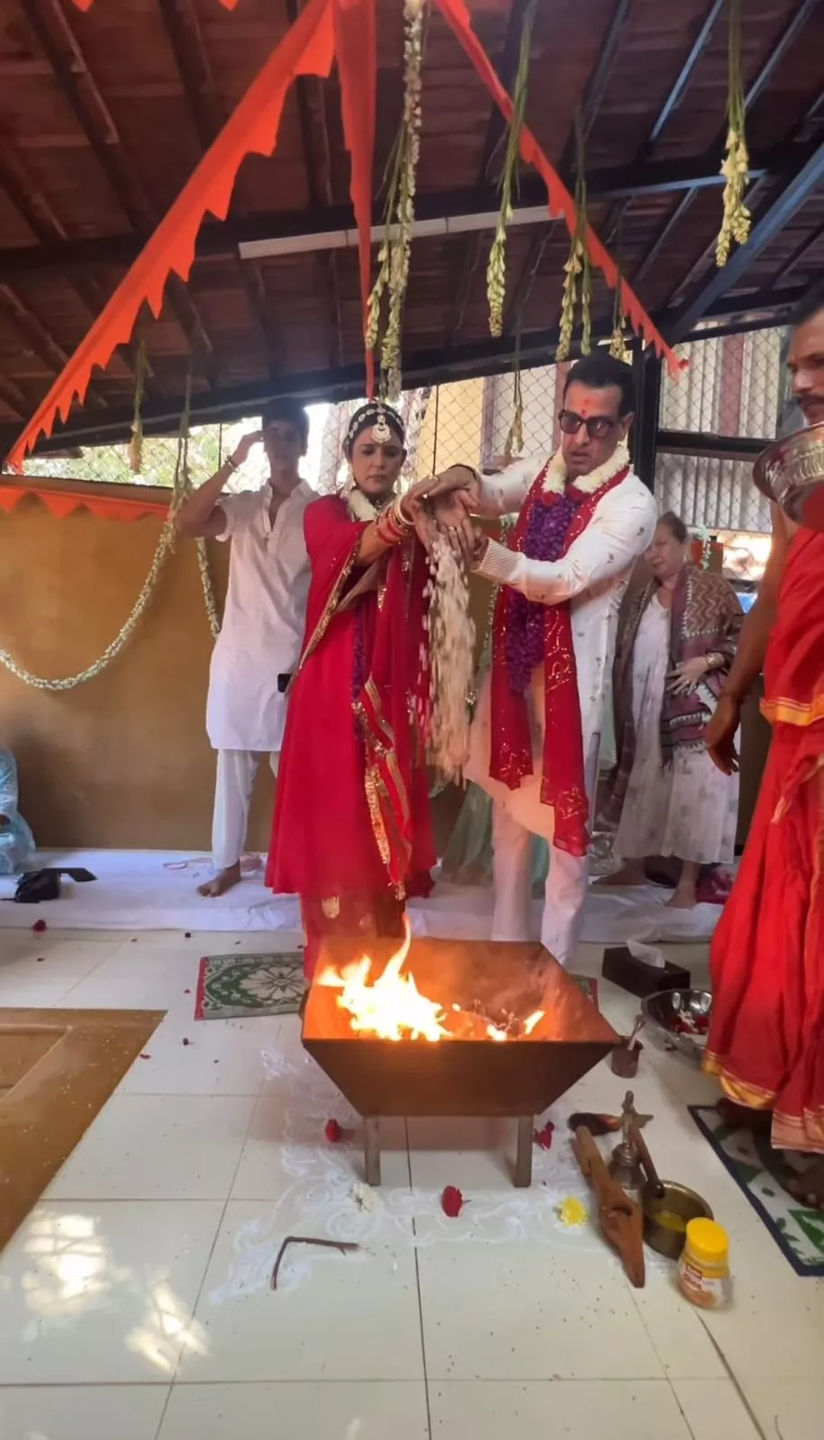 Taking to his IG handle, Ronit Roy shared stunning videos as he renewed the wedding vows with his wife, Neelam Bose on their 20th wedding anniversary. The ceremony occurred at their home's temple, and they looked lost in each other's embrace while performing the rituals. The actor opted for a cream-hued kurta embellished with golden thread work for the wedding. He teamed it with white-coloured pyjamas and a red doshala. On the other hand, Neelam turned out to be a pretty bride in a red-hued salwar suit paired with a matching dupatta adorned with golden frills near the hemline. Neelam completed her look with a dainty maang teeka and matha patti with matching statement earrings and red chooda.