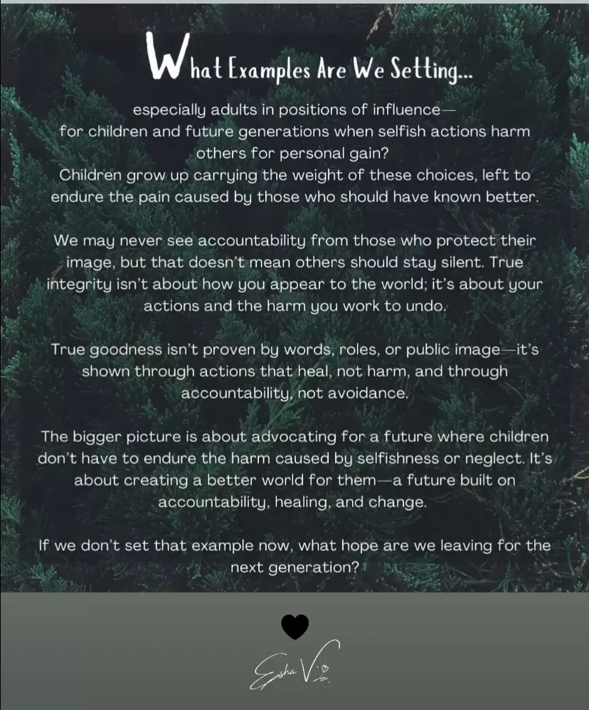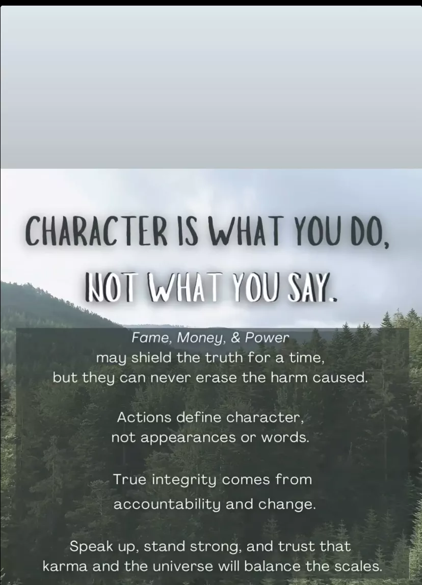 "Fame, money, and power may shield the truth for a time, but they can never erase the harm caused. Actions definie character, not appearance or words."