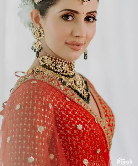 Bride, Chahat let her outfit and jewellery shine. She opted for a subtle nude base makeup to balance her bridal look. She completed her look with a subtle makeup, including a dewy base, blushed cheeks, glossy nude lipstick, shimmery eyeshadow, mascara-laden eyelashes, and highlighted cheeks. A flower-adorned bun and a small stone bindi added stars to her dreamy look.
