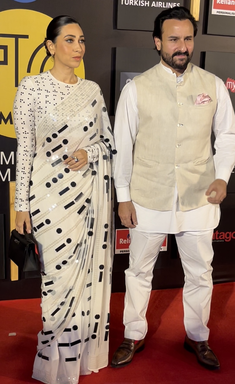 On October 27, 2023, Saif and Karisma arrived in style on the red carpet of the Jio MAMI Film Festival. Karisma looked gorgeous as always as she was decked up in a mint green-toned saree, which she styled with a close-neck full-sleeved blouse. She kept her look cheek with soft makeup and hair tied in a low bun. On the other hand, Saif looked handsome in a mint green-hued kurta with sleeveless jacket.