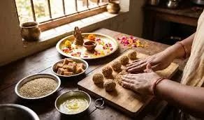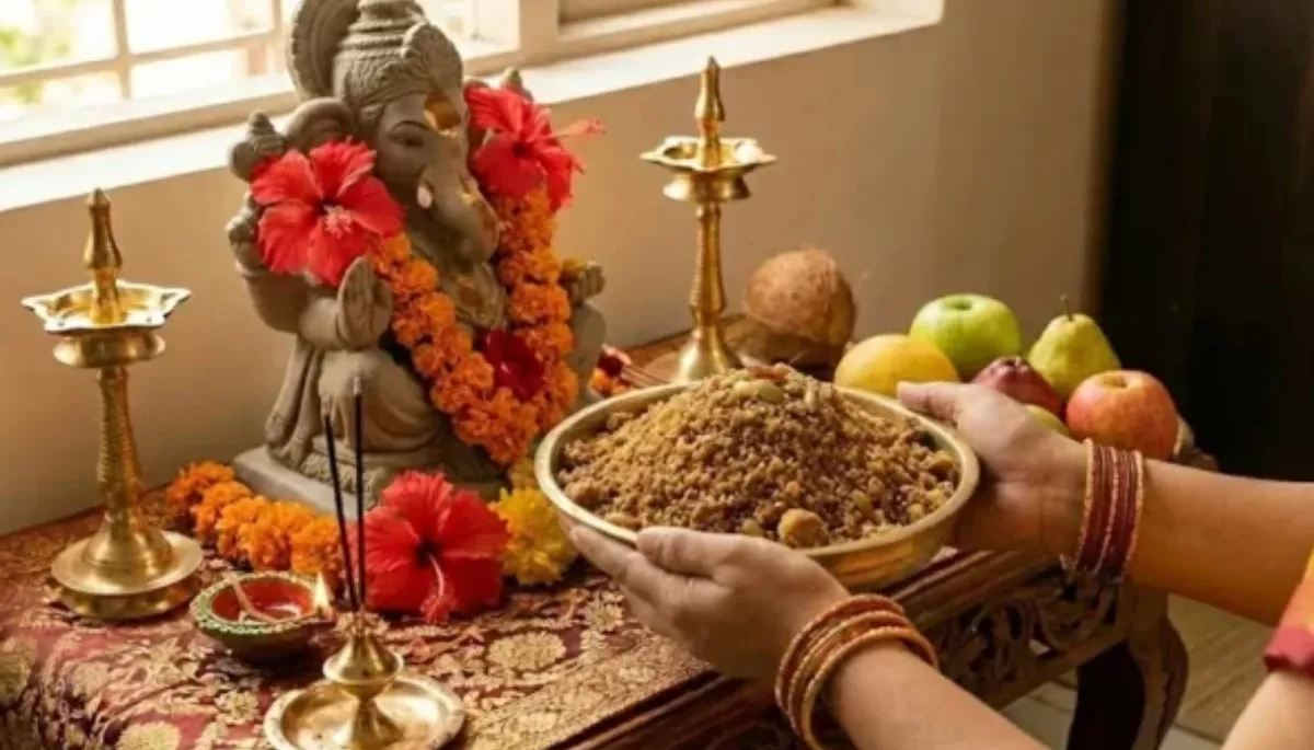 On the occasion of Sakat Chauth, devotees should bathe and meditate in the morning. Then they should prepare Til Kutta from white sesame seeds and jaggery. After this, set up an altar on a stool with a pot of water, roli, akshat (rice), Til kitta, and sesame seeds in a bowl. After this, Satiya should be drawn on the pot of water, and 13 dots should be added to it. Now, the Sakat Chauth vrat katha should be read by taking Til kutta in the hand. Once the puja is done, keep til kutta in your hand in a bowl and add some money to it. Now, take the bayna to your mother-in-law or a woman of similar status and touch her feet.