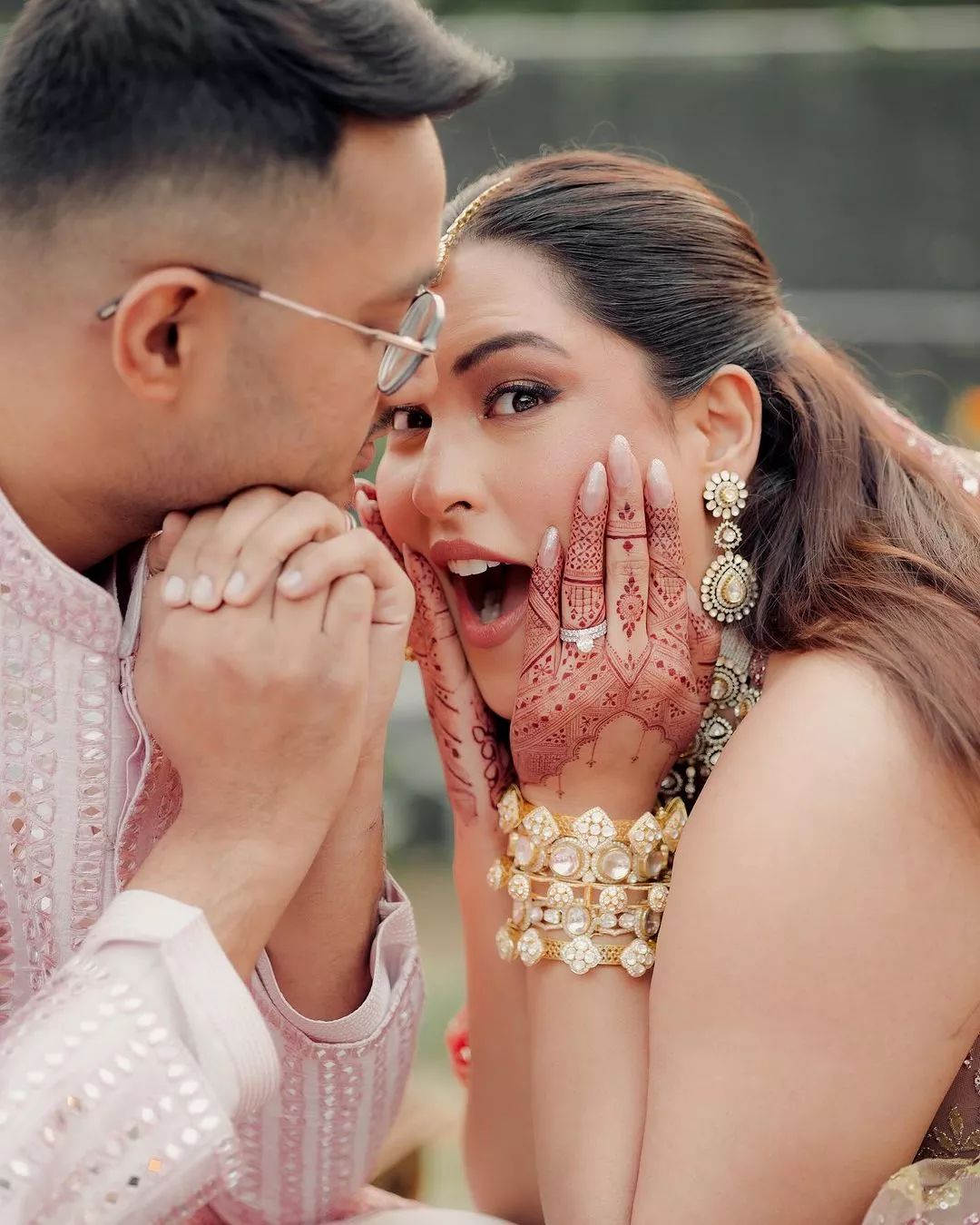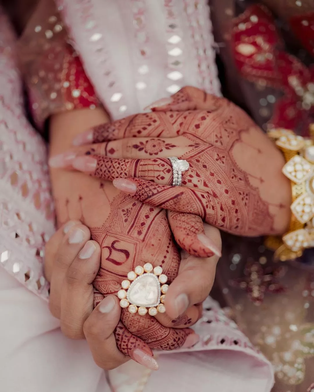 Sakshi completed her look with a broad pearl and stone-studded choker, matching earrings and a maang teeka. She radiated pure happiness while posing for the lens and looked joyful. In one of the pictures, Sakshi flaunted her mehendi with Raghav and her initials, and her huge solitaire ring immediately caught our attention. Meanwhile, Sakshi's beau, Raghav complemented her in a pink-hued bandhgala sherwani with mirror work embellishments. Alongside the pictures, Sakshi penned: