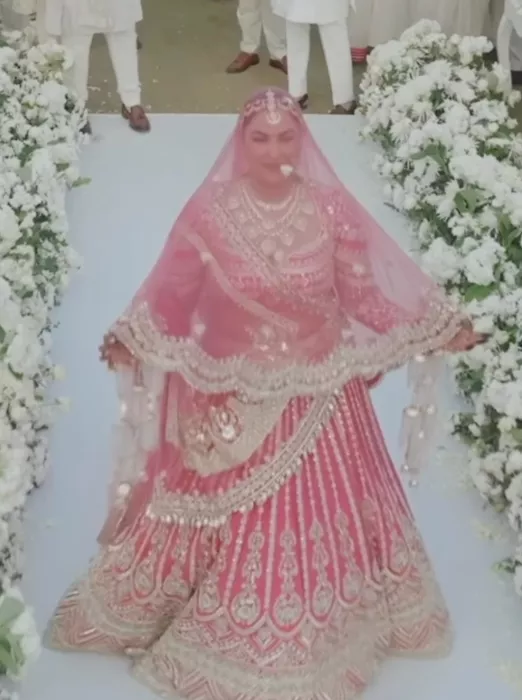 Sakshi Sindwani's look is an inspiration for many brides. The fashion influencer stunned in a beautiful pink-toned lehenga. Her outfit featured a full-sleeved, heavily embellished blouse with a flared skirt. She styled her look with a matching dupatta, which was pinned over her shoulder. She also added a fun factor to her look with a long veil.Â