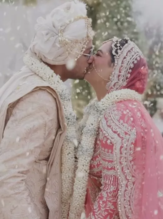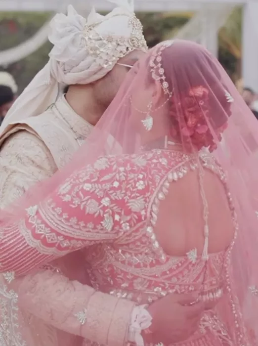 Sakshi accessorised her look with a huge layered neckpiece with heart pendants, a nath, and an oversized sheesh patti and chooda. She further accentuated her look with subtle soft makeup and hair tied in a low bun with rose petal adornments. On the other hand, her groom looked dapper in a white-hued sherwani. The couple sealed the deal with a kiss.