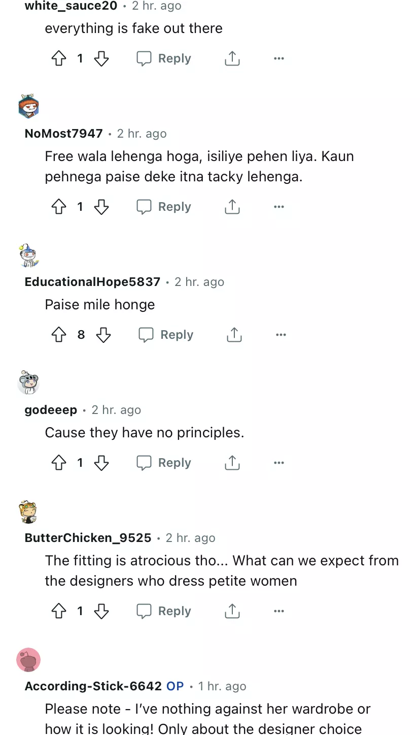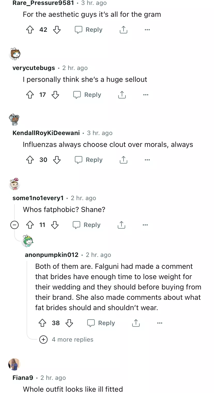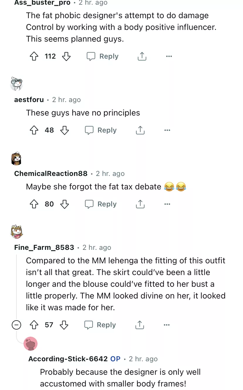 As soon as the look was posted, a Redditor posted the screenshot of Sakshi's post. One user wrote, "The fat phobic designer's attempt to do damage Control by working with a body positive influencer. This seems planned guys." Another commented, "Falguni had made a comment that brides have enough time to lose weight for their wedding and they should before buying from their brand. She also made comments about what fat brides should and shouldnât wear." One netizen commented, "Free wala lehenga hoga, isiliye pehen liya. Kaun pehnega paise deke itna tacky lehenga."