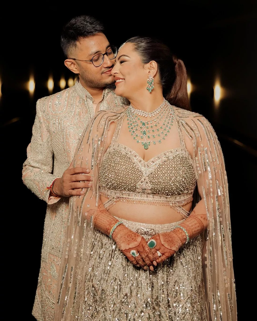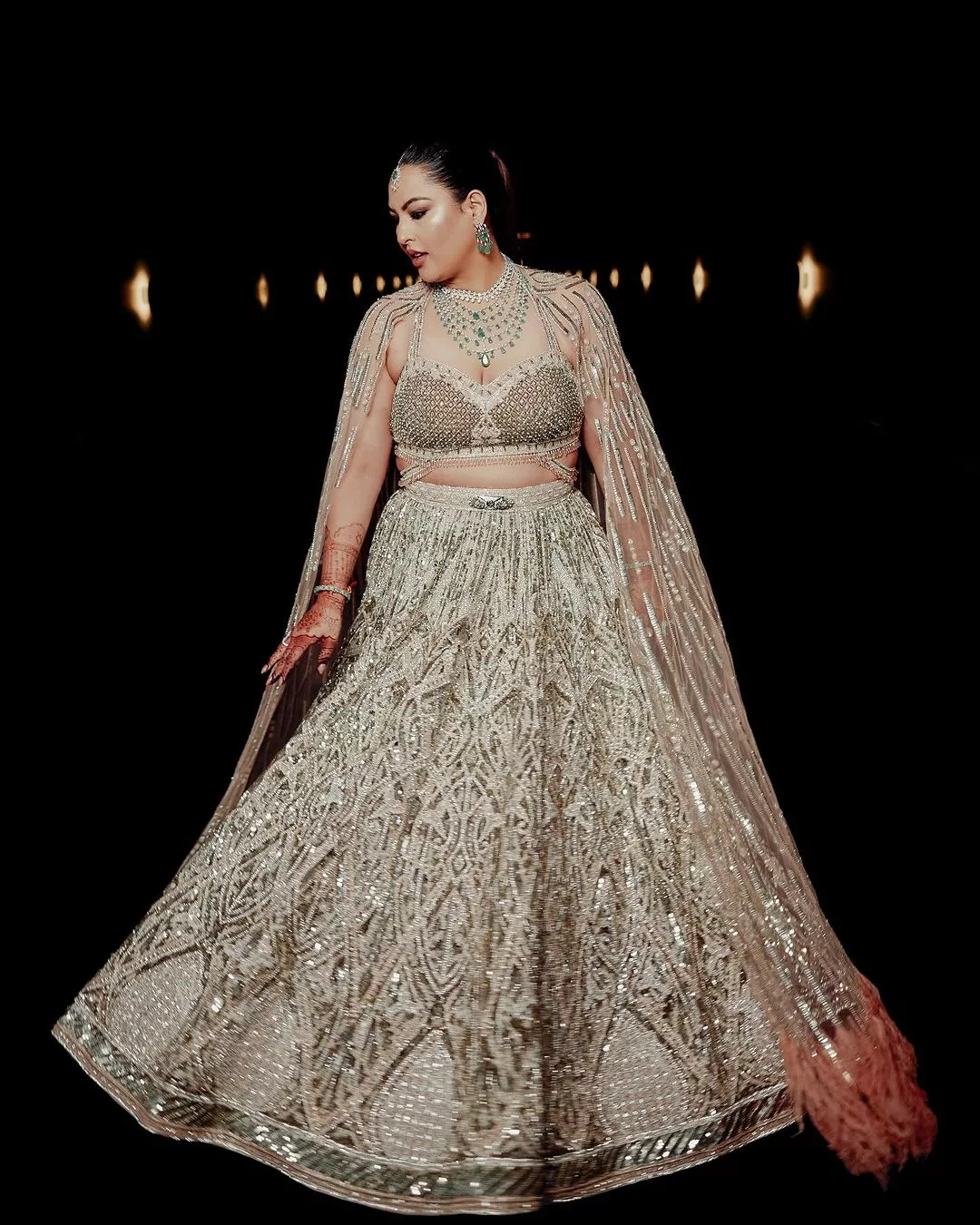 On January 28, 2024, Sakshi took to her Instagram handle and posted a couple of pictures of her sangeet look. The influencer, Sakshi, was decked up in a Falguni and Shane Peacock lehenga, which featured a heavy skirt, a strappy blouse, and a cape with feather-detailing at the hem. Her look was on point, and she beautifully carried the tricky piece. While netizens loved Sakshi's look, they were not happy with her choosing Falguni and Shane Peacock, who once shamed plus-size brides.Â