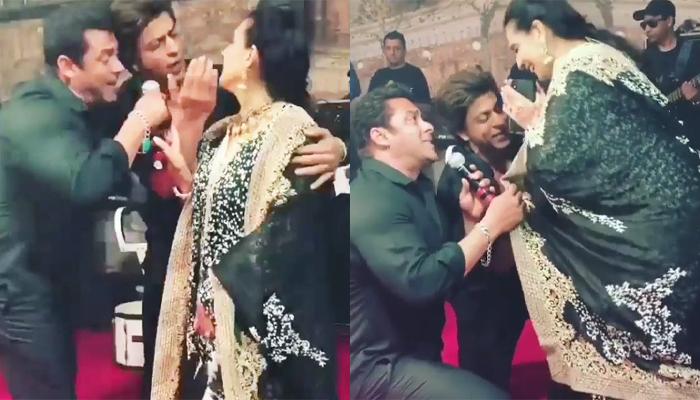 But what they sang, and for whom they sang, is the most important. So, without any further ado, let us tell you how SRK and Dabangg Khan rocked it last night. In one of the videos, which has now gone viral, we can see Shah Rukh and Salman recreating a perfect Karan Arjun moment. Singing the highly revered song from the movie, Ye Bandhan To Pyar Ka Bandhan Hai, the two went down on their knees to woo none other than, bride Sonam’s mother, Sunita Kapoor. In the video, you would see, Sunita screaming, “Control them!”, but no help came her way, and rightly so! After all, how often do we get to see such moments? Sunita Kapoor’s husband, Anil Kapoor himself could be seen enjoying the moment, standing behind the back with Ranveer Singh. Take a look the video: