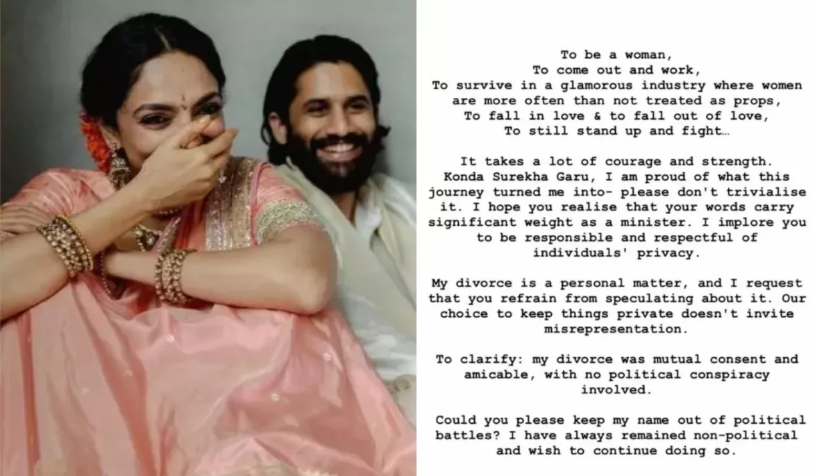 It was on August 8, 2024, when Naga Chaitanya got engaged to Sobhita Dhulipala. Well, Samantha didn't react to it. But recently, a politician mentioned that the split between the actress and Chaitanya was caused by political influence on KT Rama Rao's part. Samantha lashed out at the politician and asked her not to trivialise her journey, as well as talk about her personal life. She further mentioned that her divorce was made by mutual consent and no political influence was behind it.