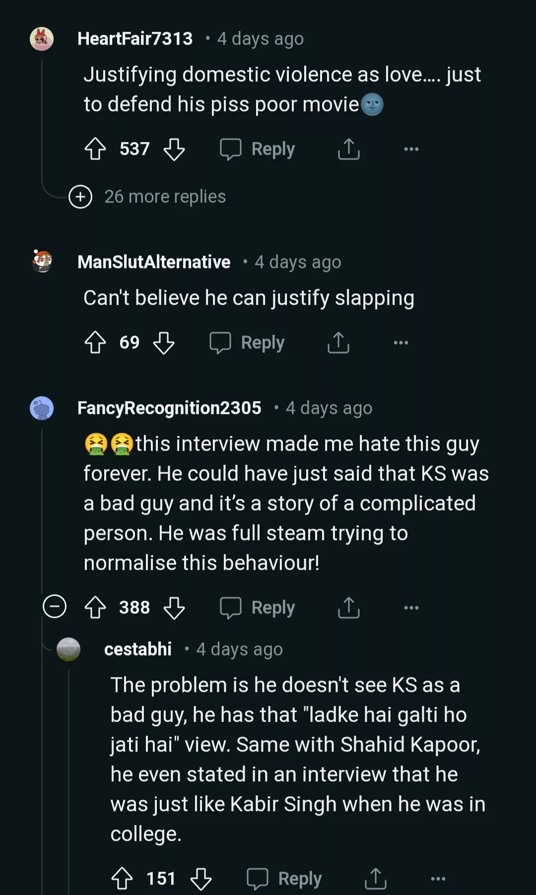 As soon as the clip was shared on Reddit, netizens reacted to Sandeep’s statements and called out the director for subjugating women in a relationship. One of the users wrote, “Someone should slap him to see his emotions.” Another commented, “Justifying domestic violence as love.”