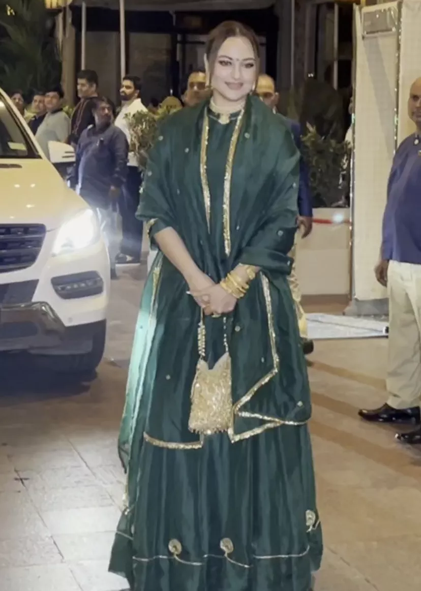 Sonakshi Sinha also made a stylish entry as she arrived with her beau, Zaheer Iqbal. While Zaheer looked dapper in a blue-hued tuxedo, Sonakshi was decked up in a teal green-hued ethnic wear. Sonakshi picked a short kurti with a flared skirt, and a dupatta. She accessorised her look with a gold neckpiece, and matching earrings. Subtle makeup with hair tied at the back and a bindi accentuated her look.