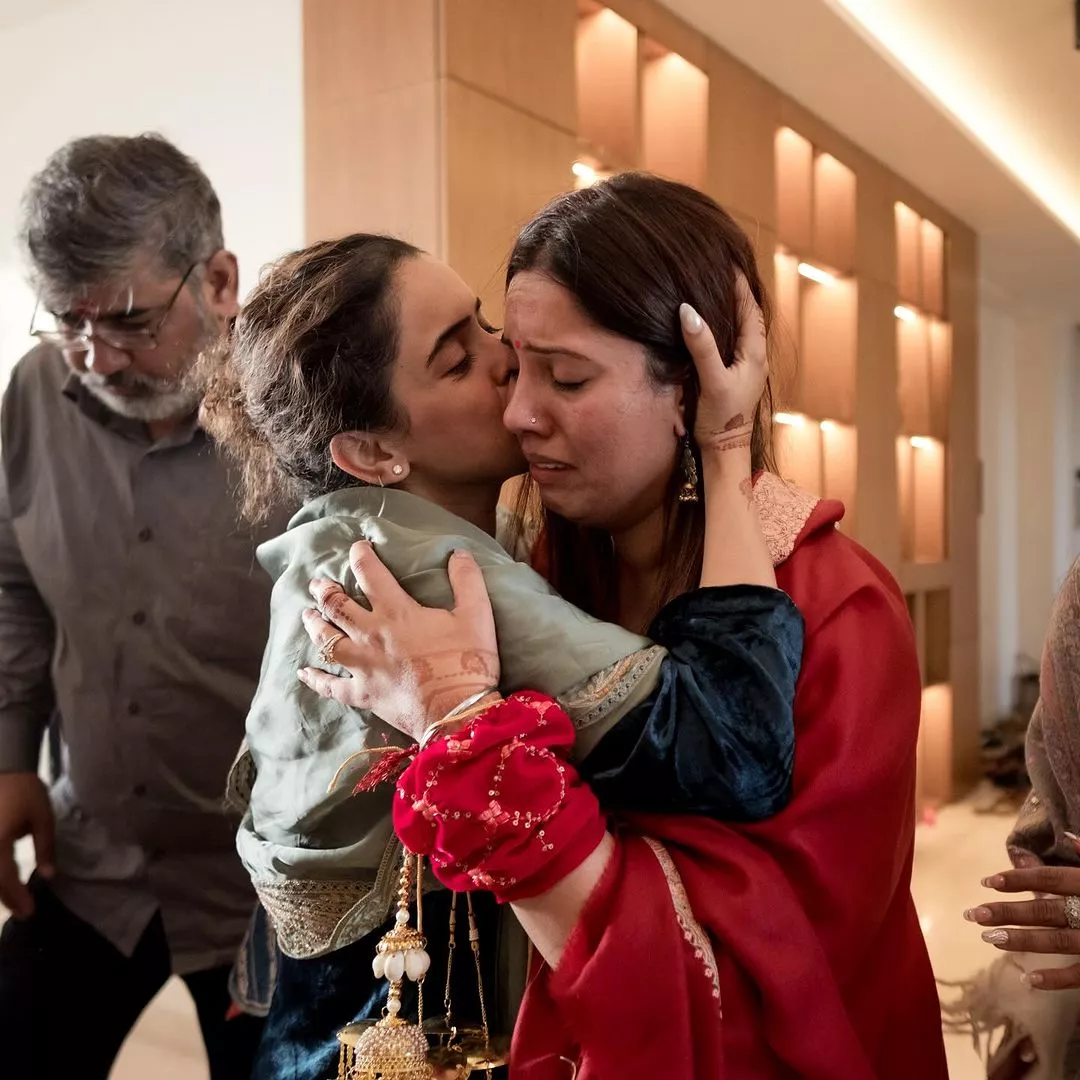 Even Sanya Malhotra took to her official Instagram account to announce to the world that her sister, Shagunn, has found a new home for her heart. On December 11, 2023, the actress posted a few more glimpses of her sister's wedding festivities. In the photos, the two sisters look visibly emotional. In the first photo, Sanya is seen fondly planting a kiss on her sister's cheek, while the latter is almost on the verge of crying. The rest of the photos are a compilation of all the moments when the 31-year-old actress was captured teary-eyed during her sister's wedding ceremonies. Sanya captioned the post as: