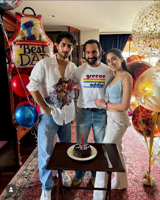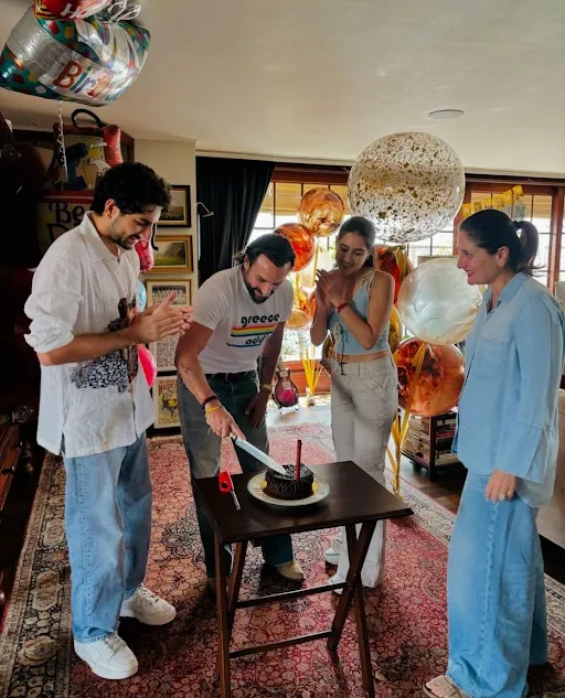 On August 16, 2024, Saif Ali Khan turned a year older, and his kids, Sara and Ibrahim, ensured to celebrate the day with their doting father. A while back, Sara took to her IG handle and shared two pictures from Saif's birthday party. The first picture showed Saif posing with his kids, and a chocolate cake was placed on a table in front of him. In the backdrop, we can see several colourful balloons which decorated the area.