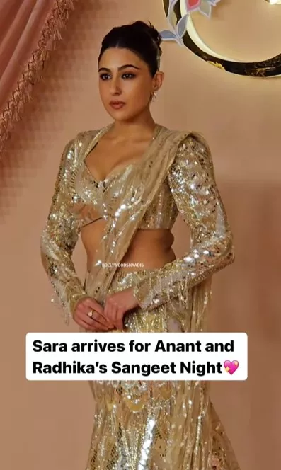 For Anant Ambani and Radhika Merchant’s sangeet night, Sara Ali Khan chose to dazzle in her ethnic best in a golden-hued embellished saree, that featured linear and sleek zari patterns on the panels of the lehenga. She teamed it with a matching full-sleeved blouse, which had a deep square neckline. Sara draped her pallu in a sleek manner and effortlessly flaunted her washboard abs. Subtle makeup, a bun as her hairdo and diamond drop earrings added an oomph factor to her OOTD.