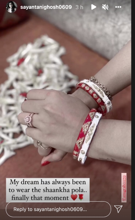 On December 5, 2021, Sayantani had shared a beautiful picture from her pre-wedding ceremony. In the photo, we can see her flaunting shaankha pola. Atop it, she had written, "My dream has always been to wear shaankha pola. Finally, the moment."