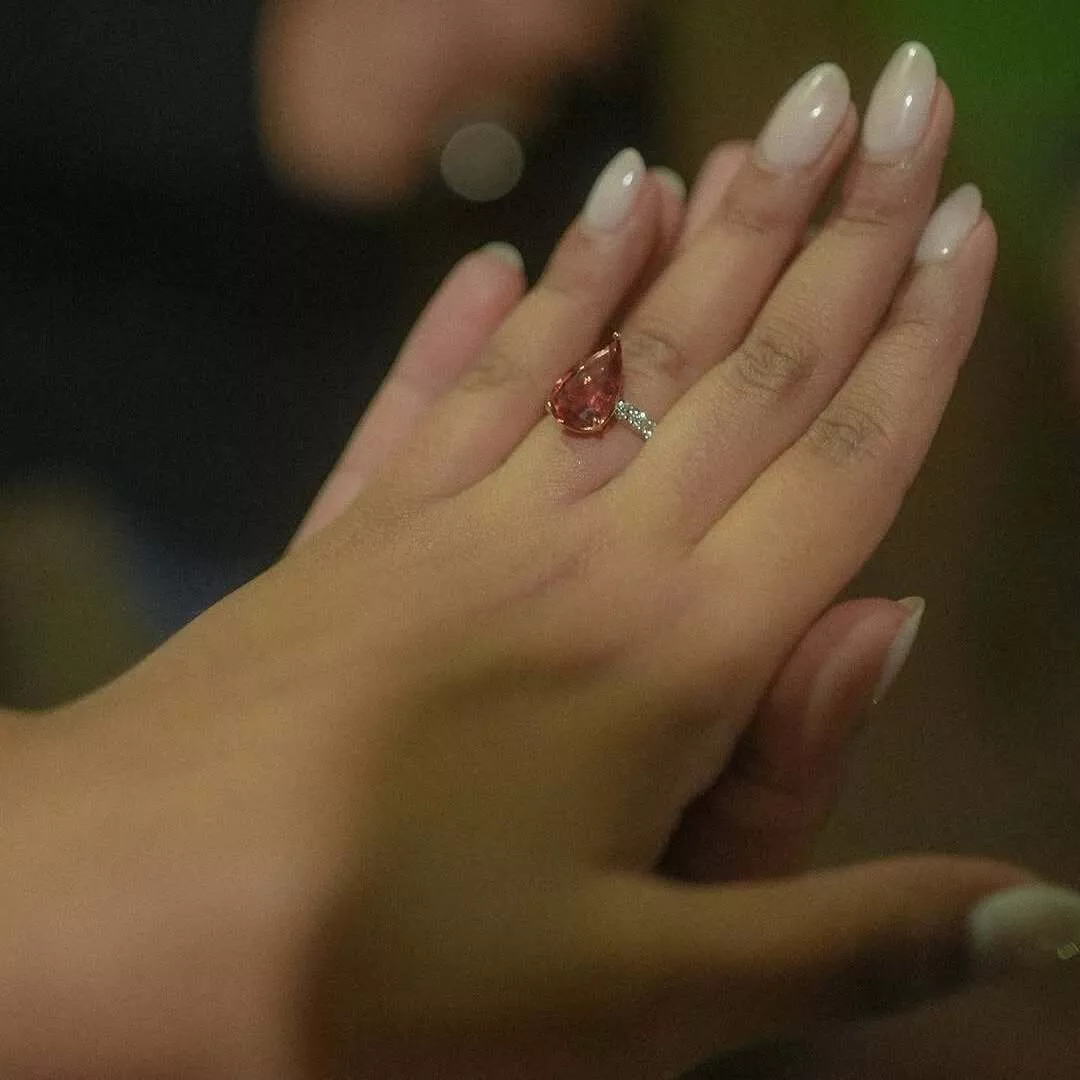Amid Sejal Kumar’s cute photo dump from her and Bharat’s special evening, we spotted a closeup shot of her ring, and it was all things gorgeous. While most engagement rings feature gold bands with diamond stones, Bharat popped the questions with a ring featuring a teardrop shape and shades of warm coral. It also featured a diamond-encrusted band. The unique piece, while exuding timeless charm, also spoke to the couple’s love for doing things their own way and likely has special significance to them.