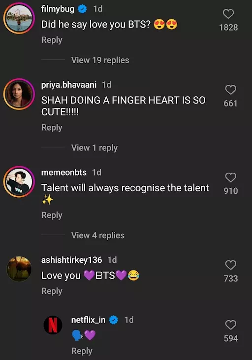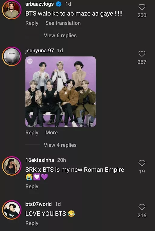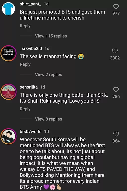 There is no denying the fact that both SRK and BTS are global icons. All the desi fans are over the moon to see the Indian superstar acknowledging their favourite K-pop band, BTS. Some even stated that SRK might just be following a script, but the acknowledgement was heartwarming. Check out the comments of the netizens: