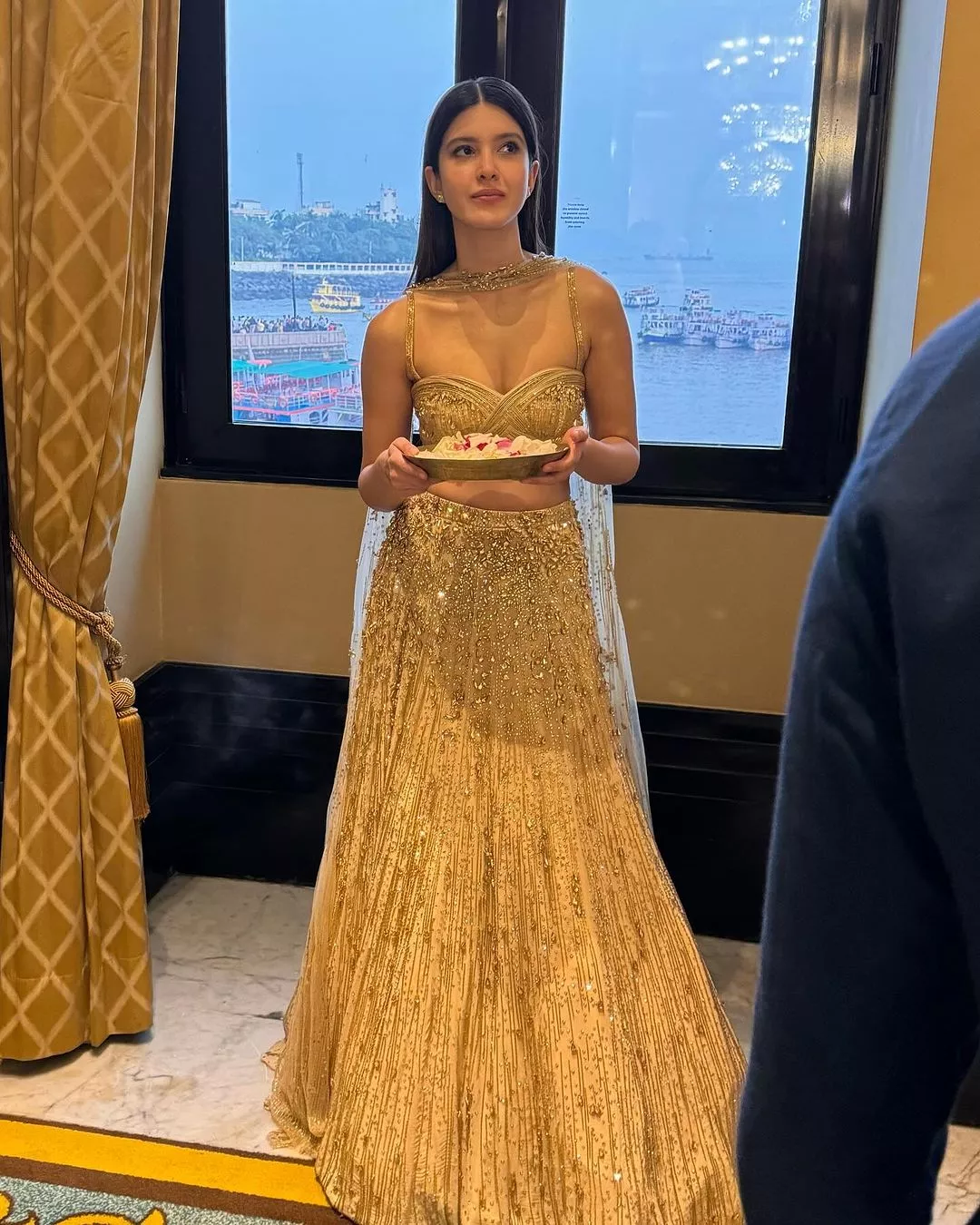Now, we stumbled upon some drool-worthy pictures from Shanaya Kapoor's BFF, Vedika Karnani and Rishi Sujan's wedding. In the pictures, from posing with Vedika and fixing her dupatta to holding a plate filled with flowers, seemingly for the Varmala moment, Shanaya was seen doing many such things that every bridesmaid can relate to. Moreover, Shanaya grabbed the attention with her look for the day. Shanaya opted for a shimmery golden-hued lehenga paired with a metal bralette and a sheer dupatta. She kept her look minimal and opted for subtle makeup.