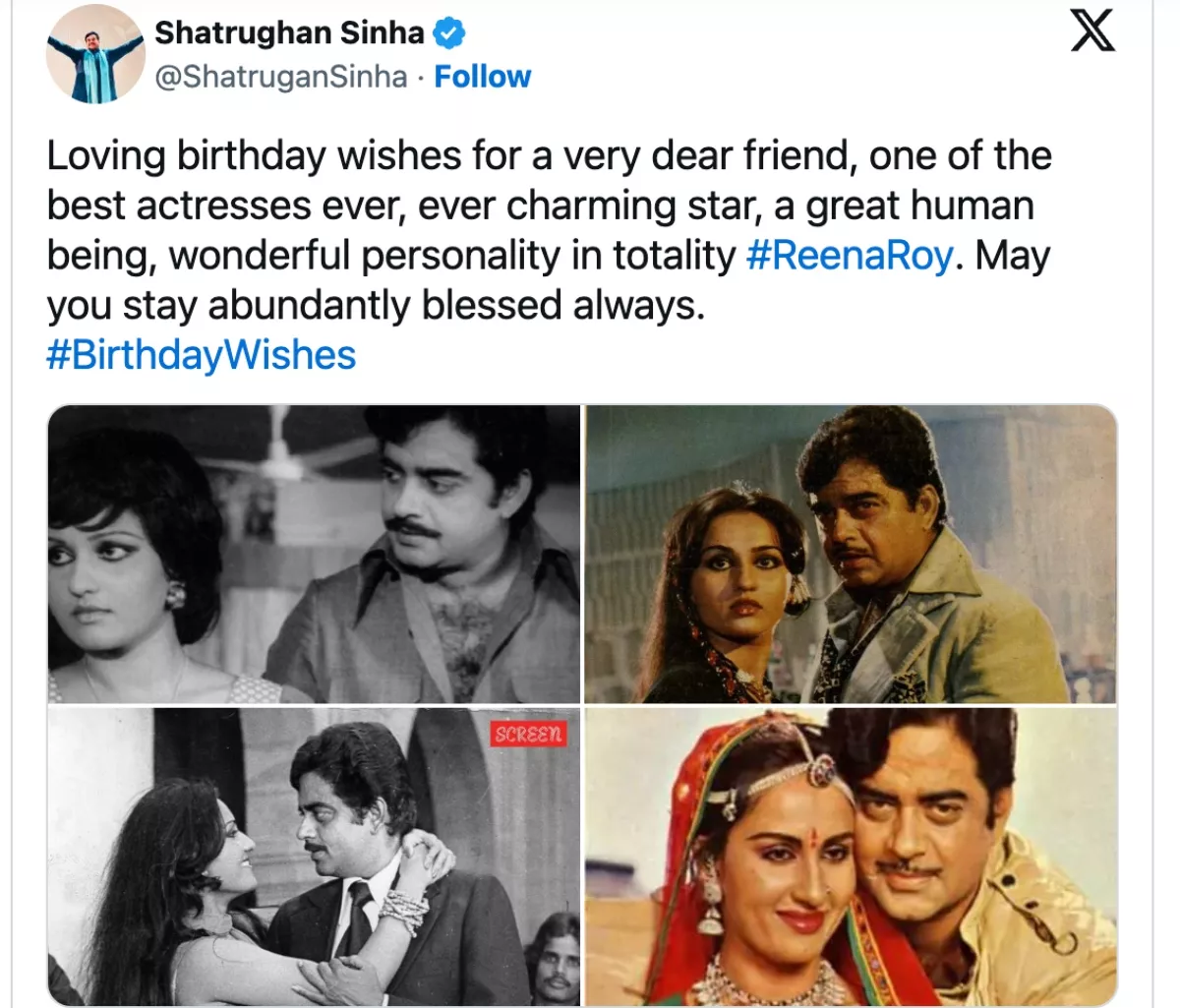 Bollywood veteran actress, Shatrughan Sinha, took time out from his busy schedule to send birthday wishes to Reena Roy. The actor shared a still from their films they had worked together years ago while extending his wishes to the gorgeous veteran actress. For the unversed, Shatrughan Sinha and Reena Roy were involved in a romantic relationship.