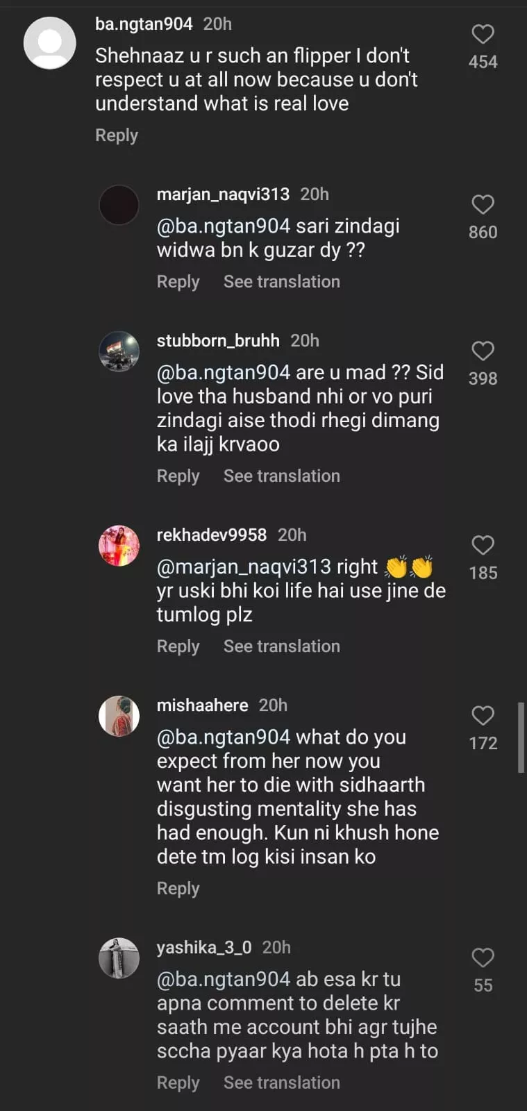 “Social media pe inko SidNaaz karke bulate hain. Ab wo duniya mein nahi raha, ab wo bhi jaha par hai wo bhi yahi chahega ki inki zindagi me koi aaye, shaadi ho jaye or bache wache ho jaye. Par social media mein kuch hai jo SidNaaz SidNaaz laga rakhte hai, arrey ye zindagi bhar kuvari rahegi kya? Aur ye jitne bhi SidNaaz SidNaaz karte hain, unme se ek ko bhi isne chun lia, to wo khud bolega ki theek hai, mai tumhare liye theek hun. Kisi ki mat suno, apne dil ki suno. Samjhe? Aur move on in life.”